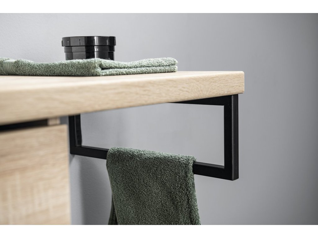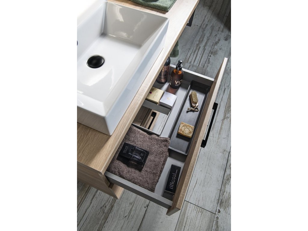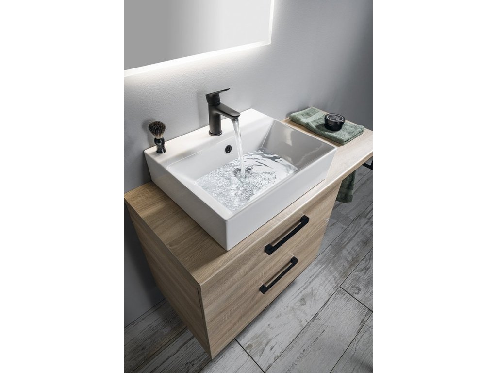 Koupelnový nábytek VEGA s deskou VEGA (HPL) v dekoru dub platin lze kombinovat s umyvadly na postavení.