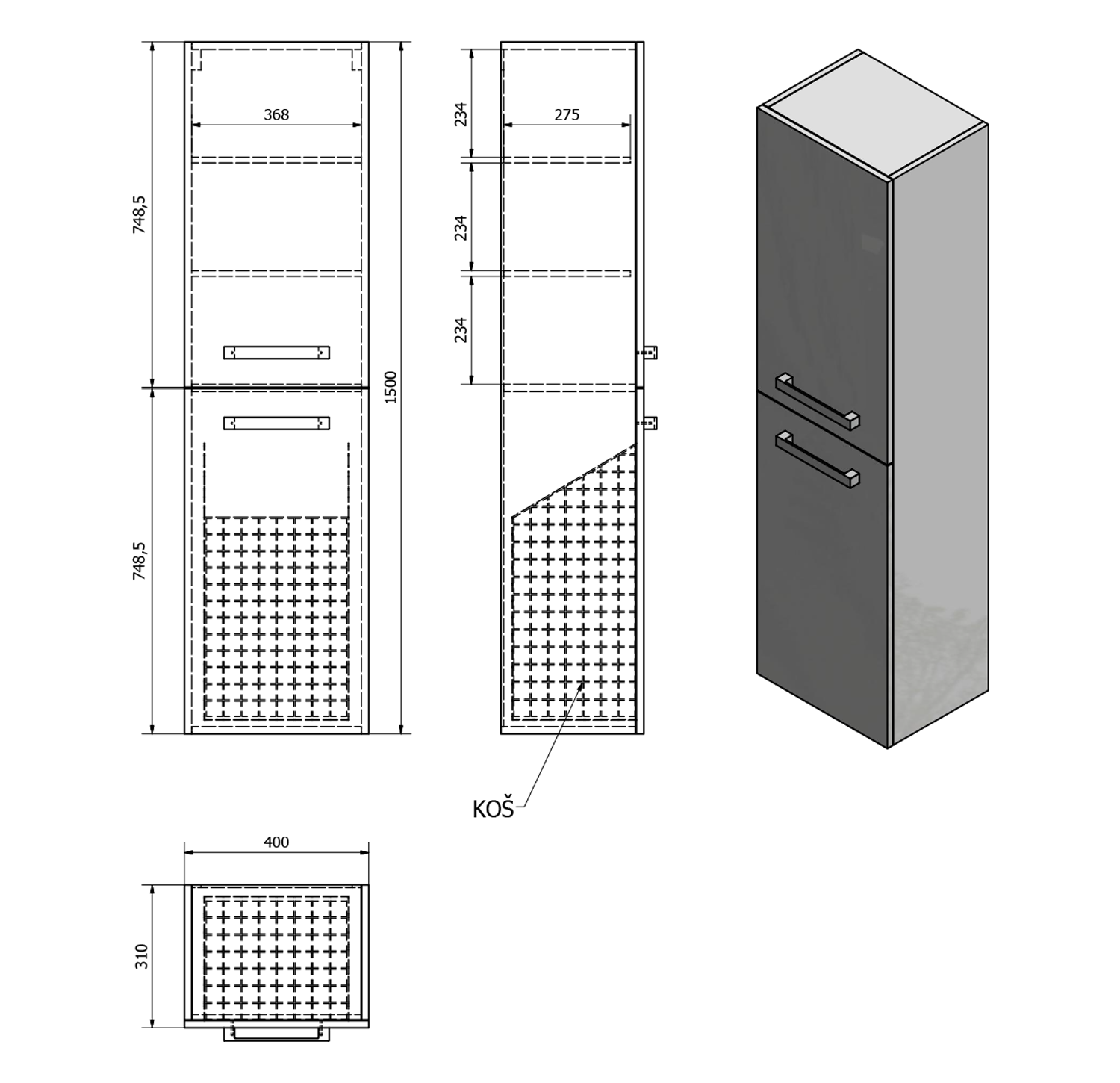 VEGA skříňka vysoká s košem, 40x150x31cm, bílá