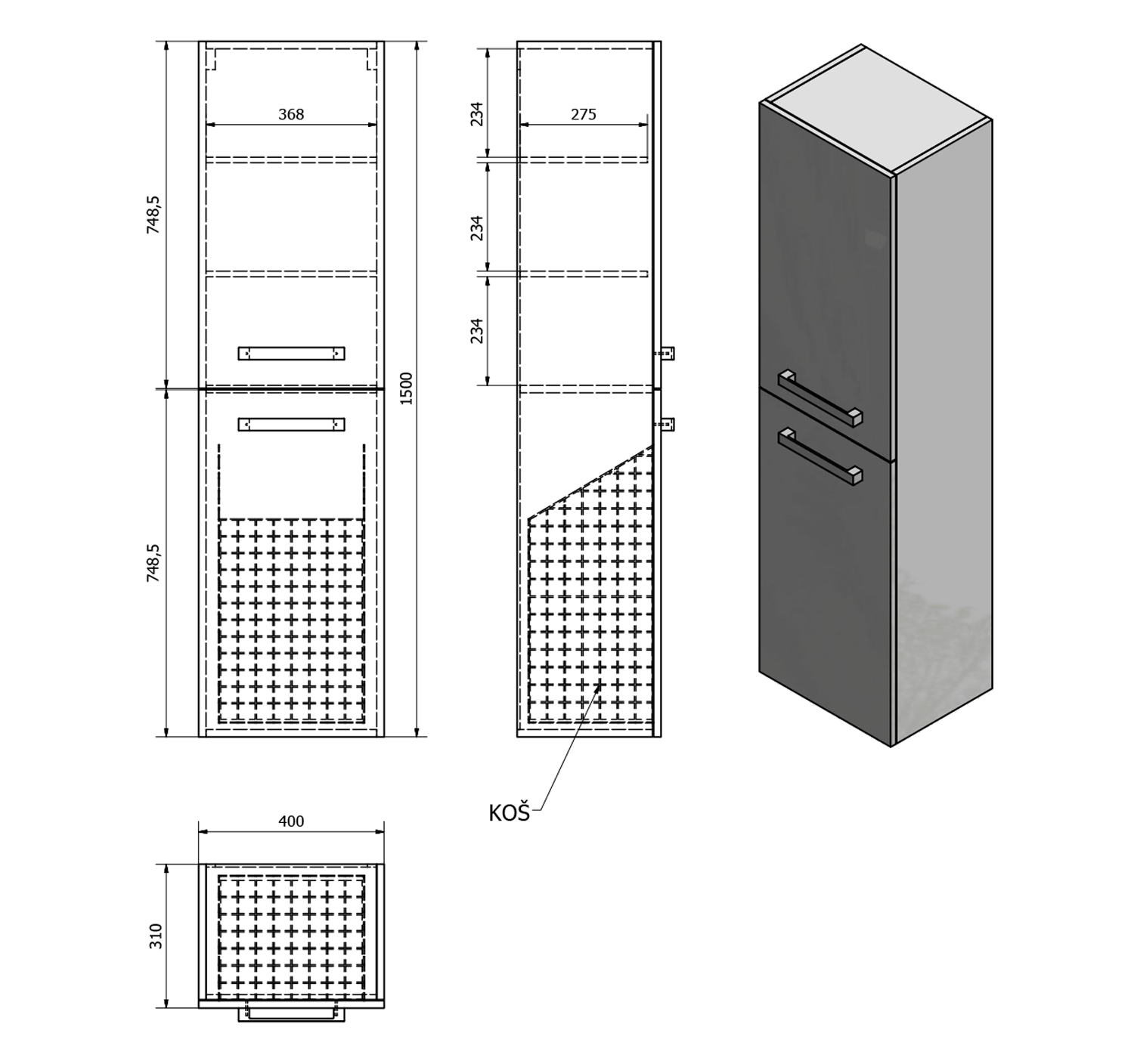 VEGA skříňka vysoká s košem, 40x150x31cm, dub platin