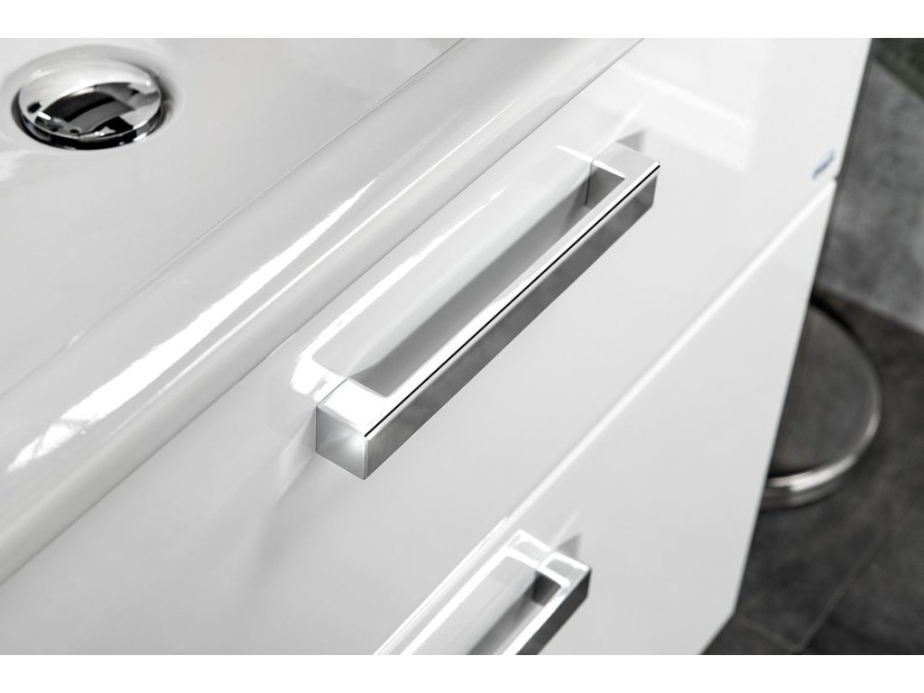 - Skříňka je dodávána s elegantními hranatými úchytkami v chromovém provedení.