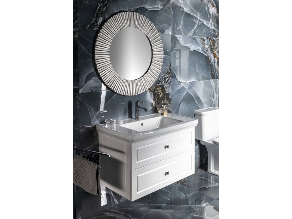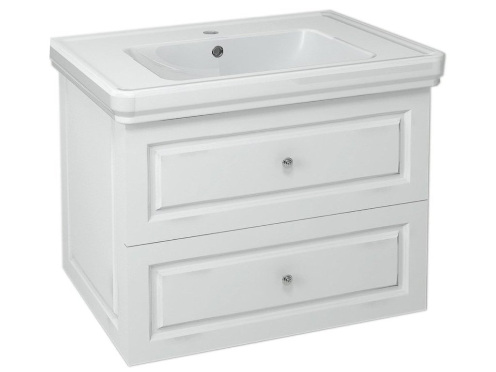 Skříňky VIOLETA ve vintage stylu s plastickým dekorem na zásuvkách i korpusu, doplněné úchytkou s krystalem SWAROVSKI, jsou vyráběny v bílém pololesklém provedení.