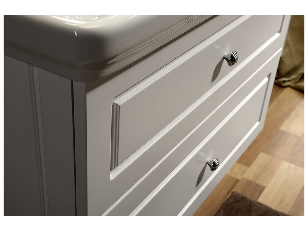 Skříňky VIOLETA ve vintage stylu s plastickým dekorem na zásuvkách i korpusu, doplněné úchytkou s krystalem SWAROVSKI, jsou vyráběny v bílém pololesklém provedení.