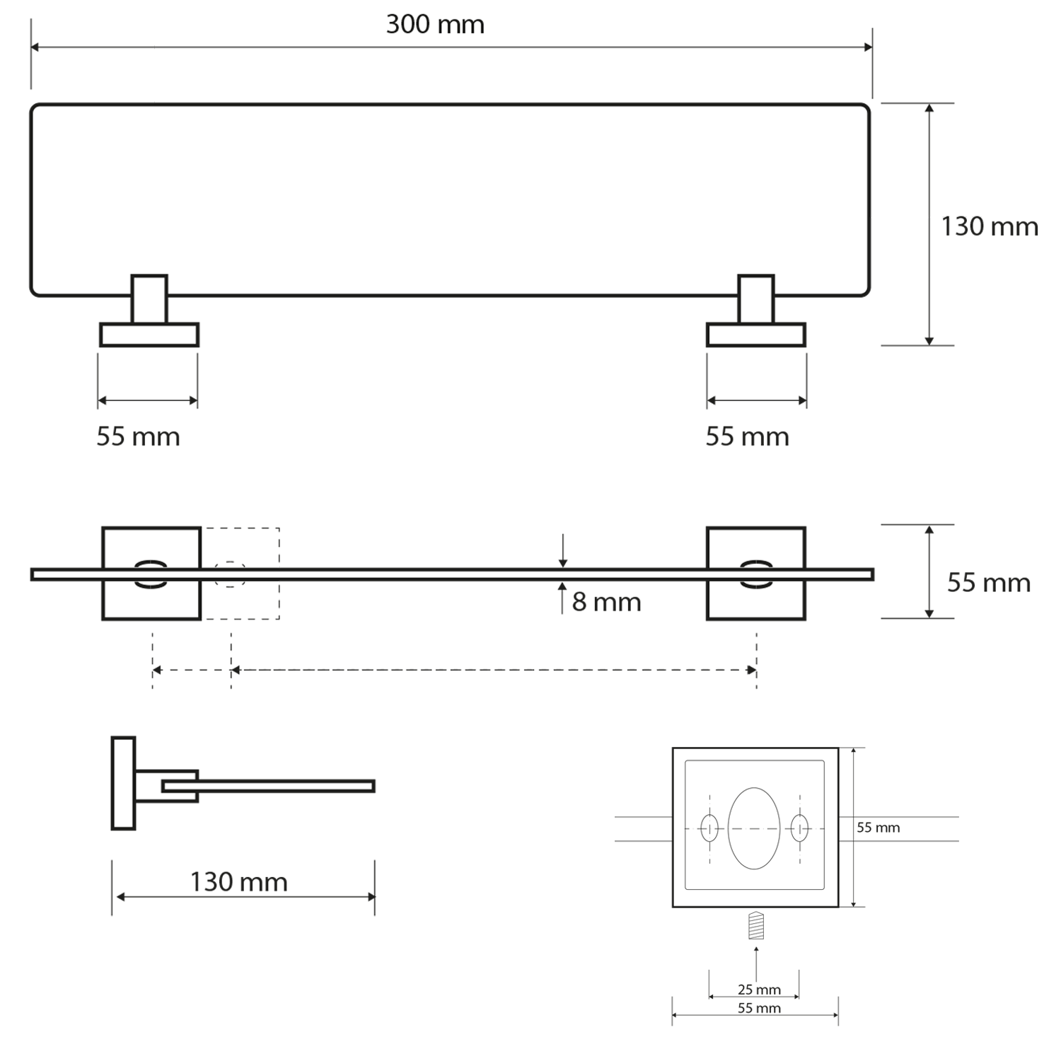 X-SQUARE polička skleněná 300x55x130mm, mléčné sklo, chrom
