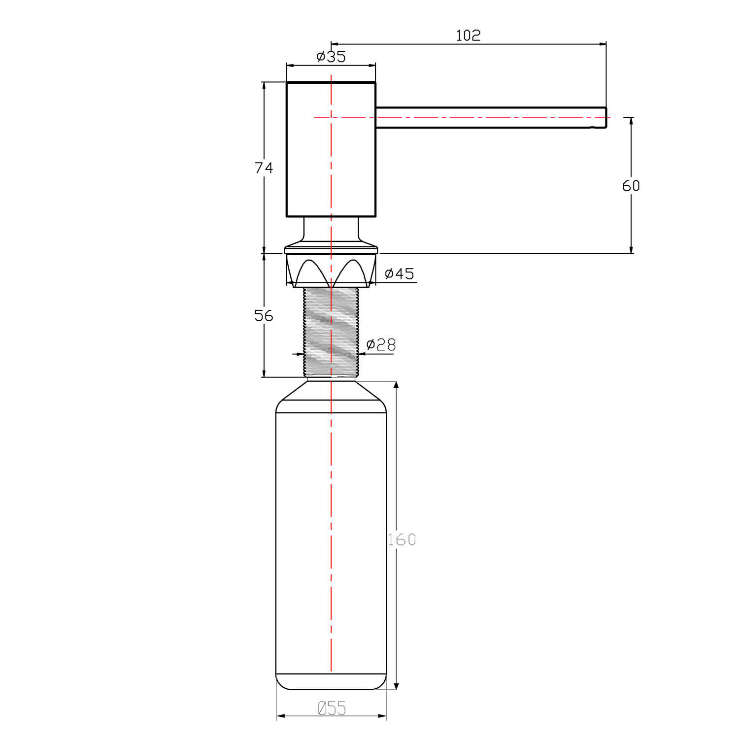 Zápustný dávkovač mýdla a saponátu s možností instalace do umyvadla místo stojánkové baterie, nebo do desky vedle umyvadla či dřezu.
