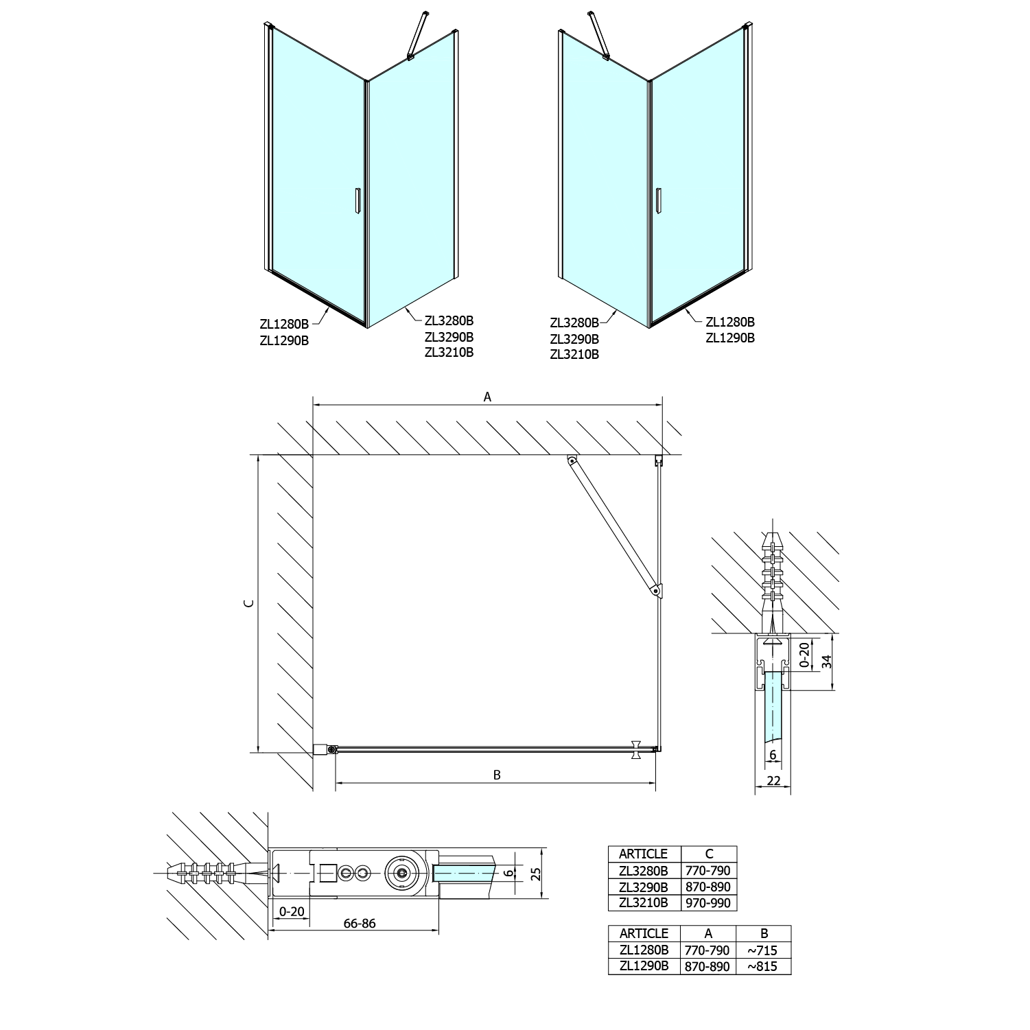 - Skládací dveře 700 až 900 mm v provedení levá a pravá lze instalovat do niky nebo v kombinaci L/R vytvořit čtvercovou nebo obdélníkovou zástěnu s rohovým vstupem