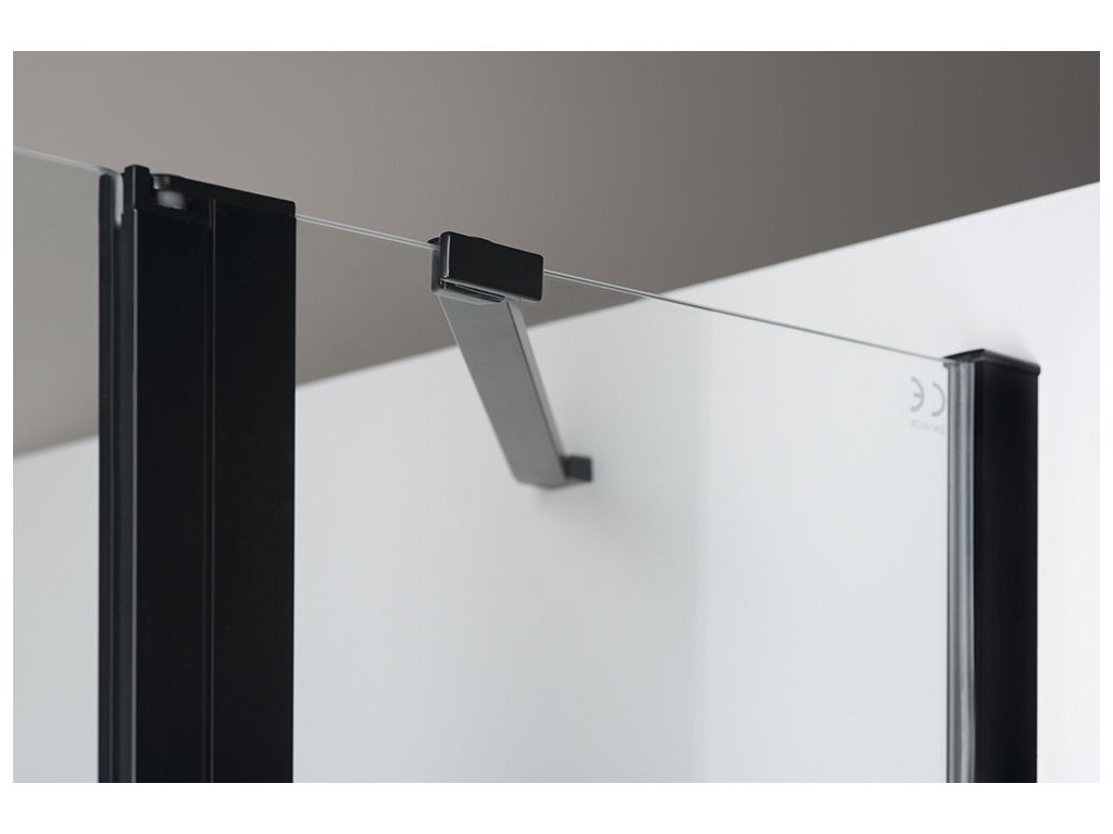 | Speciálně navržené madlo pro pohodlné otevírání dveří. | Ploché magnetické těsnění skryté v hliníkovém profilu v moderním matně černém provedení. | Stěnové nerovnosti skryje hliníkový profil v černé, do kterého lze zasunout sklo dle potřeby až 20 mm. | Otočný profil se zvedací funkcí pro pohodlné otevírání. Čistá linie - sklo protíná profil na obou stranách ve stejné úrovni. Stabilitu skel zajišťuje elegantní vzpěra s nastavitelným úhlem uchycení na obou stranách. |