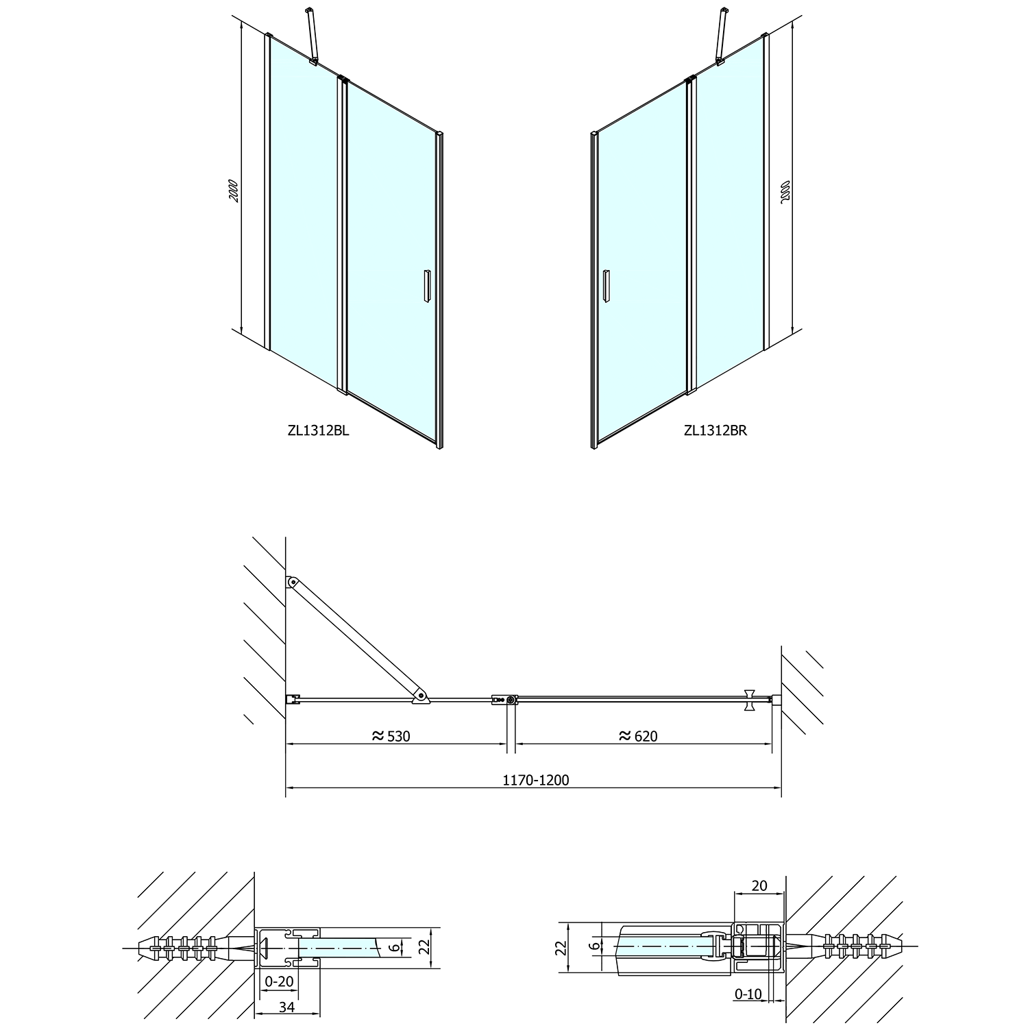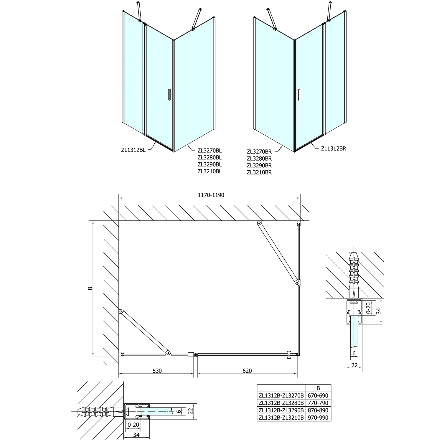- Skládací dveře 700 až 900 mm v provedení levá a pravá lze instalovat do niky nebo v kombinaci L/R vytvořit čtvercovou nebo obdélníkovou zástěnu s rohovým vstupem