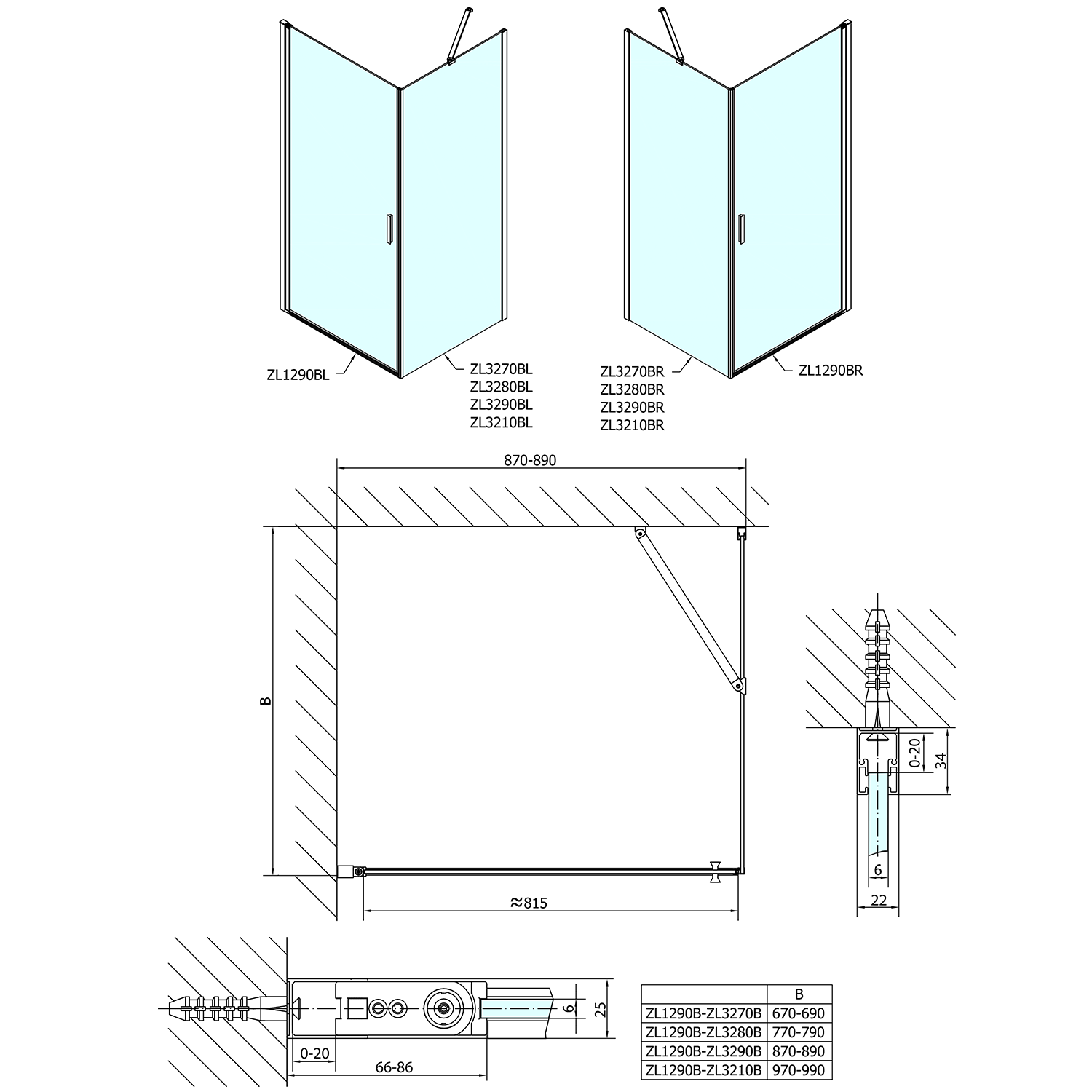 - Skládací dveře 700 až 900 mm v provedení levá a pravá lze instalovat do niky nebo v kombinaci L/R vytvořit čtvercovou nebo obdélníkovou zástěnu s rohovým vstupem