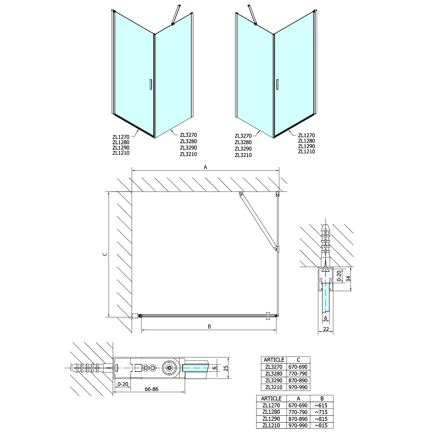 - Dvoukřídlé dveře 800, 900, 1000 a 1200 mm jsou vhodné pouze pro instalaci do niky, nelze je kombinovat s boční stěnou