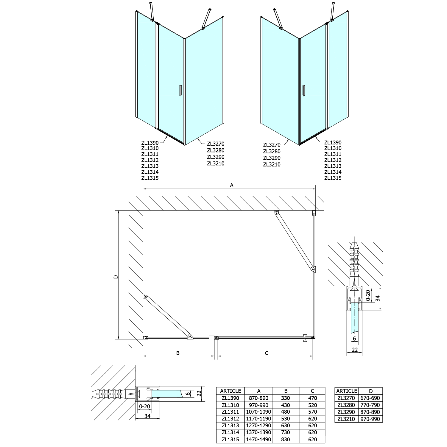 - Dvoukřídlé dveře 800, 900, 1000 a 1200 mm jsou vhodné pouze pro instalaci do niky, nelze je kombinovat s boční stěnou