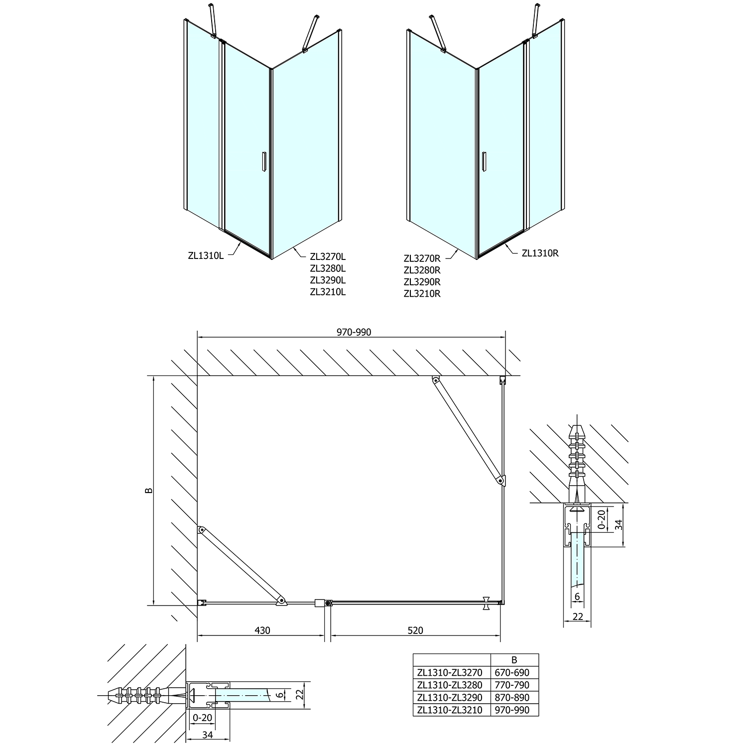- Skládací dveře 700 až 900 mm v provedení levá a pravá lze instalovat do niky nebo v kombinaci L/R vytvořit čtvercovou nebo obdélníkovou zástěnu s rohovým vstupem