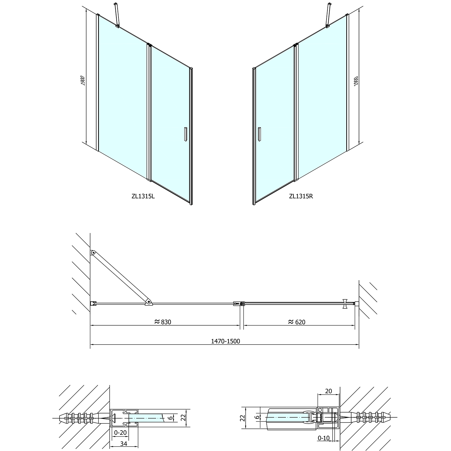 - Dveře 1600 a 1800 mm mají 2 pevné části a 2 otočné části, vhodné pouze pro instalaci do niky, nelze je kombinovat s boční stěnou