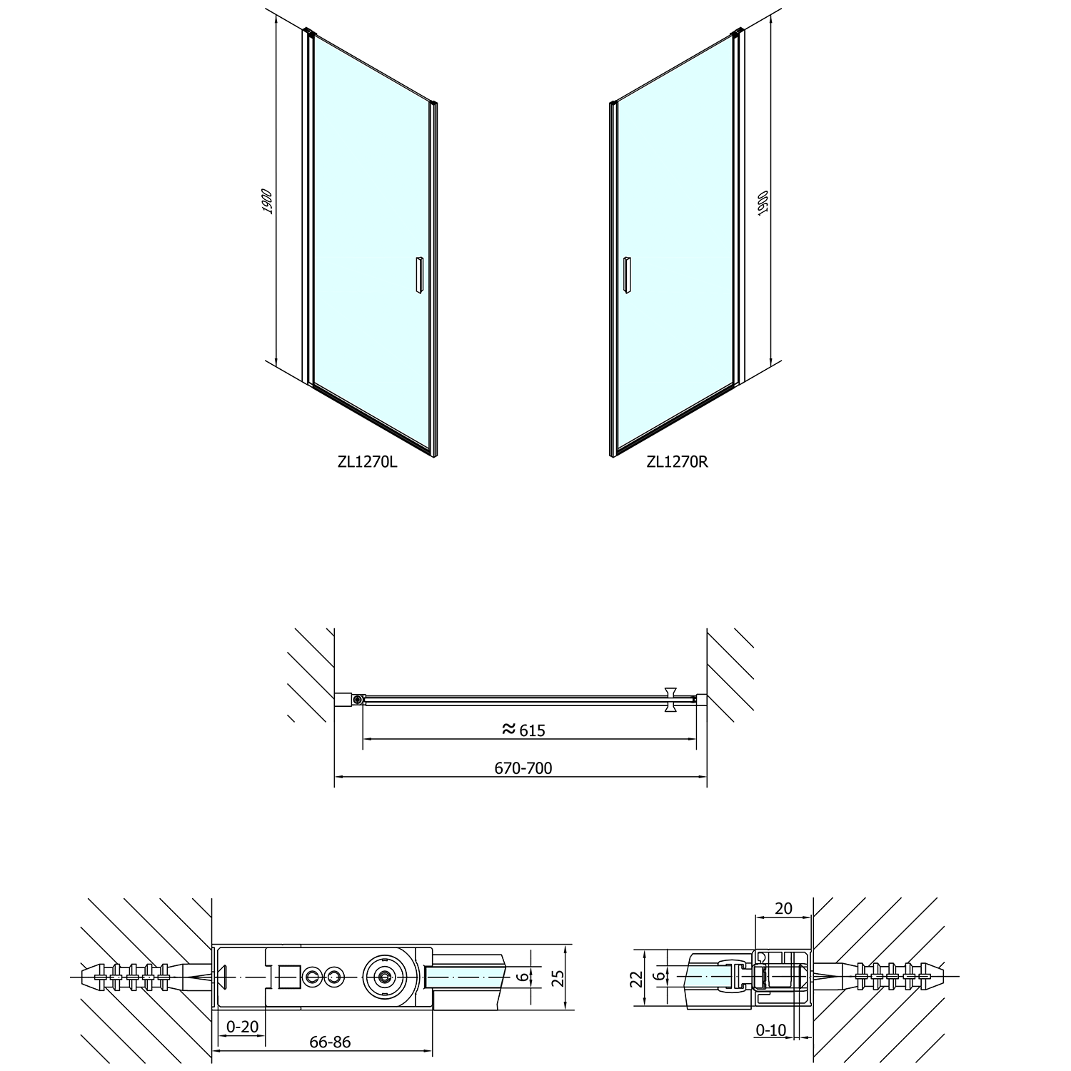 - Skládací dveře 700 až 900 mm v provedení levá a pravá lze instalovat do niky nebo v kombinaci L/R vytvořit čtvercovou nebo obdélníkovou zástěnu s rohovým vstupem