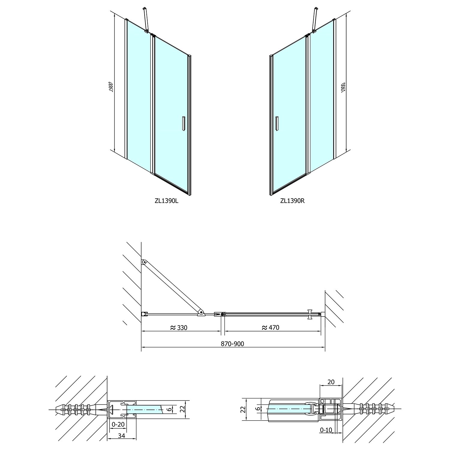 - Skládací dveře 700 až 900 mm v provedení levá a pravá lze instalovat do niky nebo v kombinaci L/R vytvořit čtvercovou nebo obdélníkovou zástěnu s rohovým vstupem