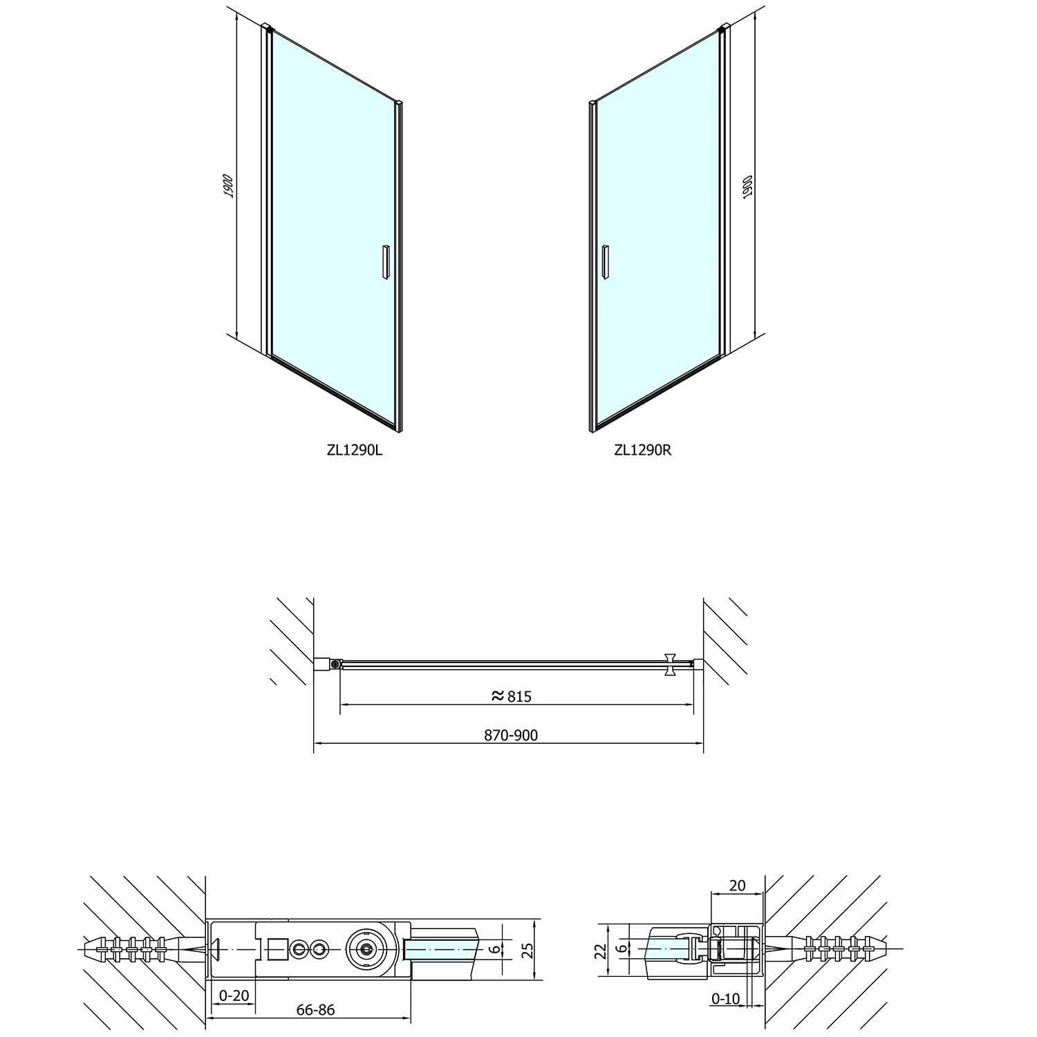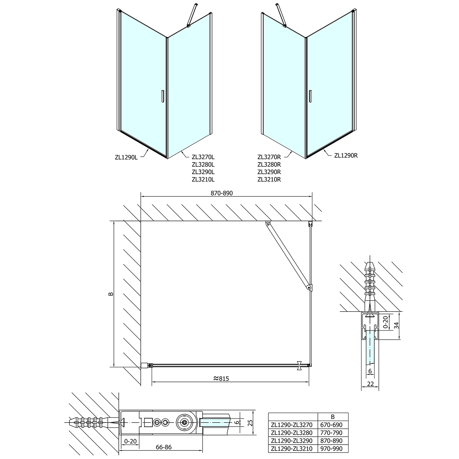 - Skládací dveře 700 až 900 mm v provedení levá a pravá lze instalovat do niky nebo v kombinaci L/R vytvořit čtvercovou nebo obdélníkovou zástěnu s rohovým vstupem